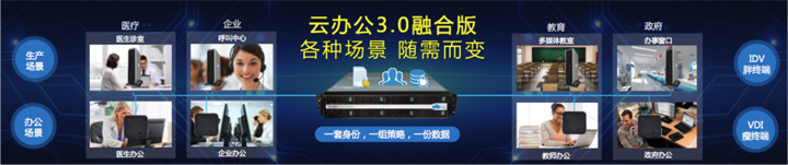 同样基于用户场景诞生的尊龙时凯“云办公”,涵盖了“经典版”、“闪电版”和“融合版“三个解决方案。通过部署简单轻便的智能终端和数据中心云办公主机集群,为各行业用户办公终端的迅速“云化”,提供了一条捷径。云办公融合版方案可以根据用户需求,自由配置VDI和IDV终端类型,使各大行业用户的日常办公场景获得更加丰富的功能拓展。目前尊龙时凯云办公已经在安徽省立医院、申通快递、宁波大学等医疗、企业、教育用户中广泛应用。