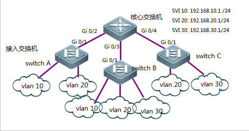 3)分别在3 台接入交换机创建VLAN,为各VLAN 分配Access 口,指定上连核心交换机的trunk 口。本用例以接入交换机Switch A 为例说明配置步骤。